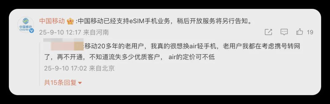 官方表示,中国移动已经支持 eSIM 手机业务,稍后开放服务将另行告知。