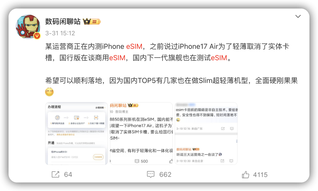 而随着中国联通拥抱国行 eSIM 业务,其他几家运营商明显也没闲着。