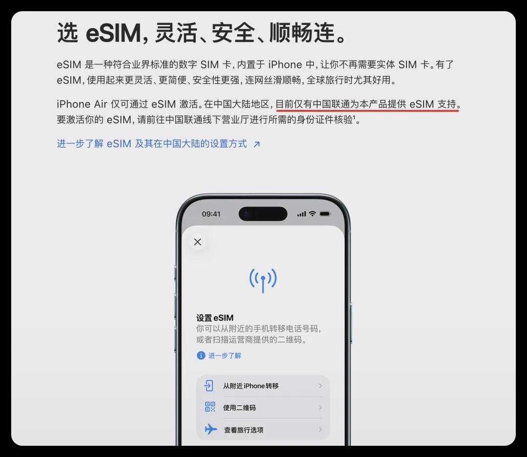 目前,iPhone Air 国行版本已开放了预购页面,并表明暂时仅有中国联通一家独占 eSIM 业务。