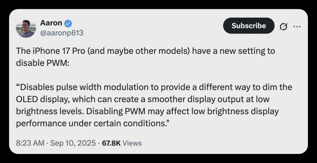 禁用该选项后,系统将采用不同的 OLED 调光方式,从而在低亮度下实现更柔和的显示输出。