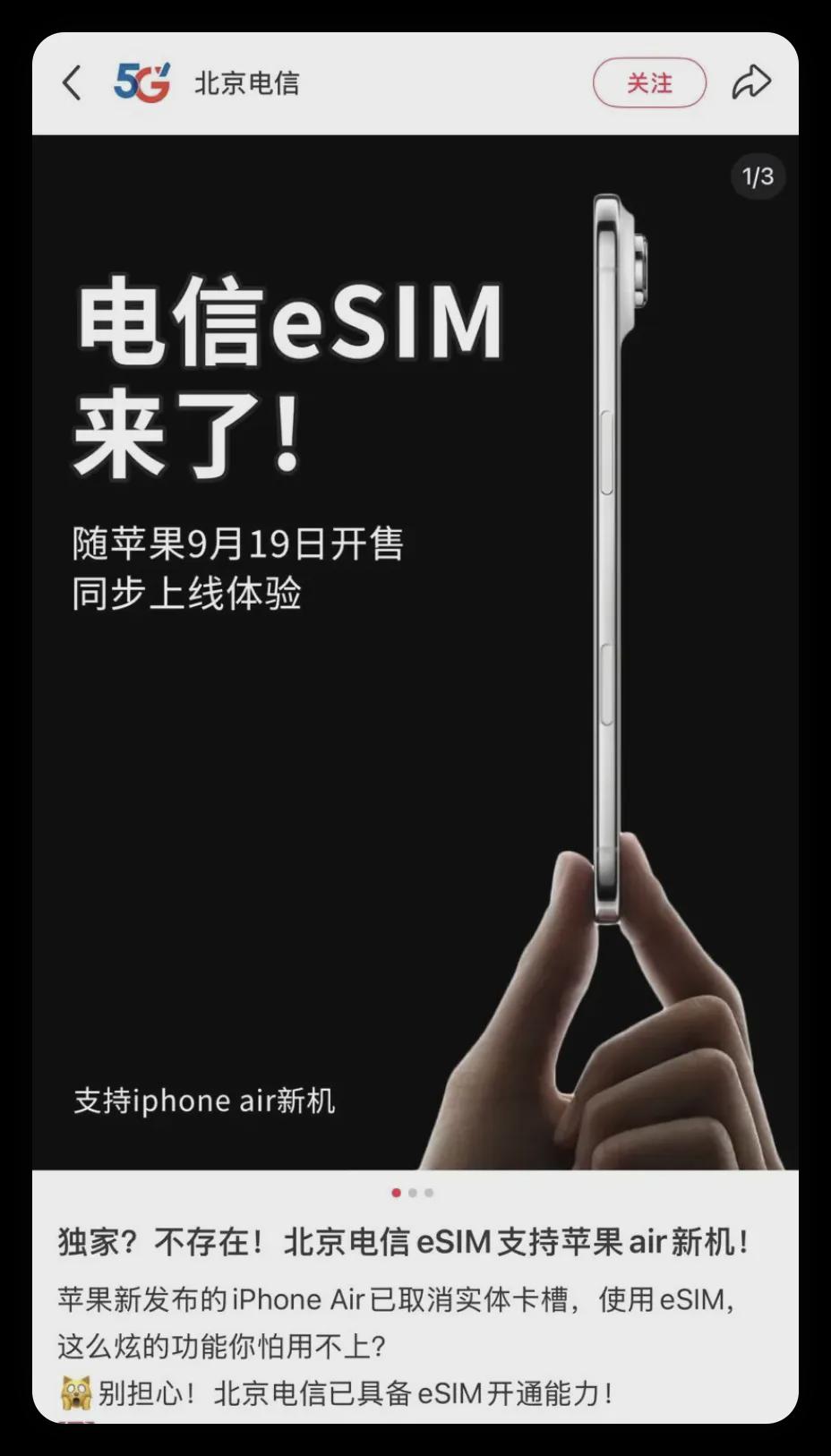 随后,北京电信官方账号,也官宣了自家将接入 eSIM 的消息。