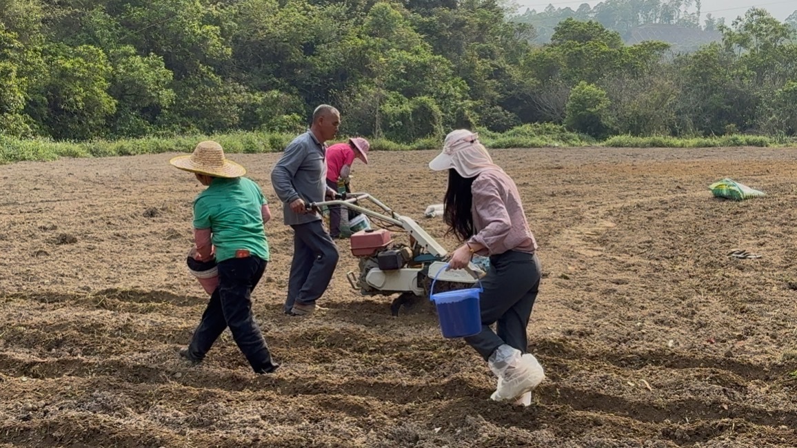 胡娜与村民们一起在开垦后的撂荒地上播撒肥料